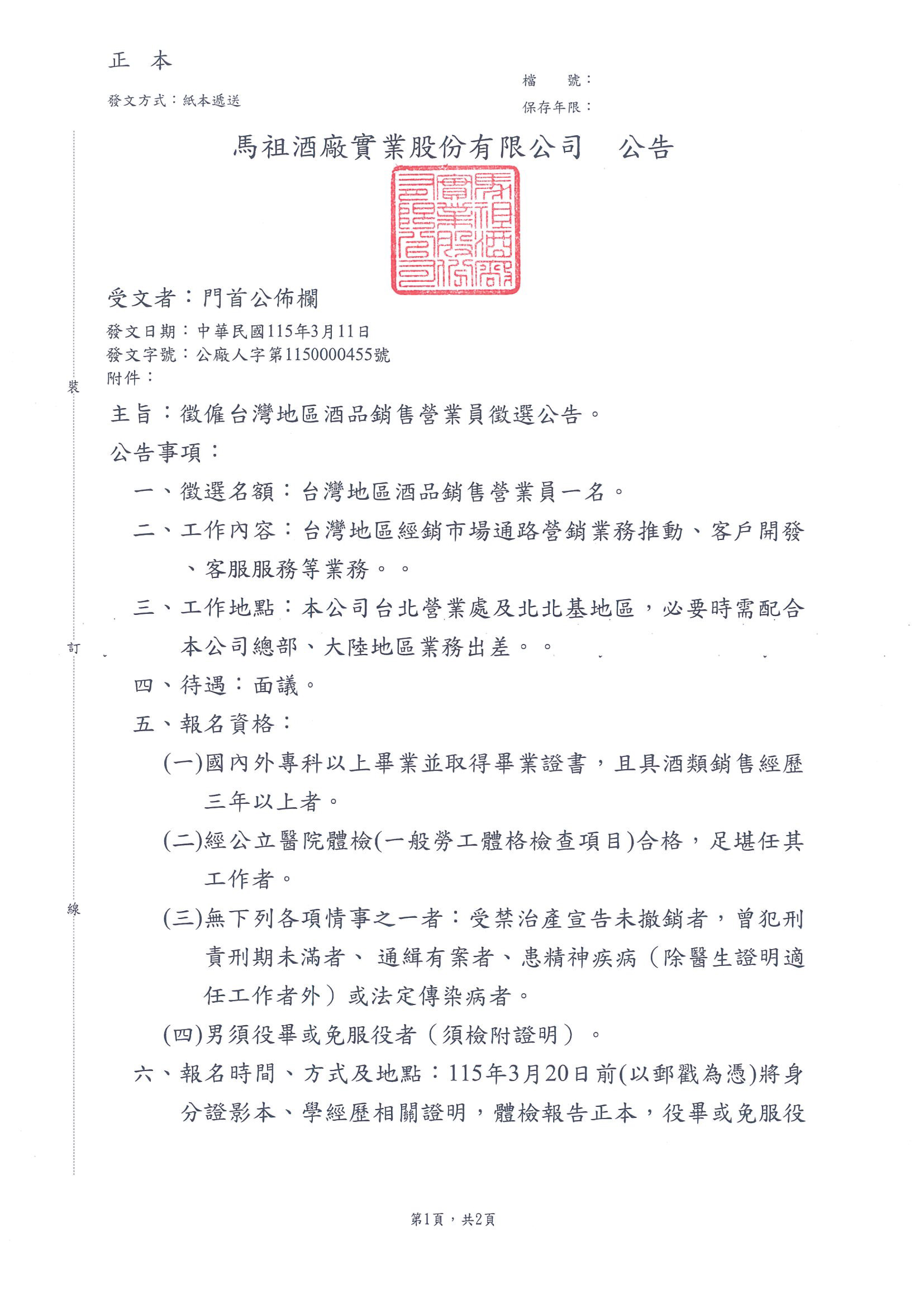 徵台灣地區酒品銷售員公告